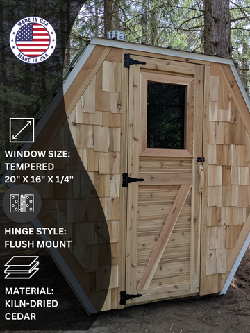 Our cedar sauna doors are designed for long-lasting performance. We've perfected this design over 3 years, using it for our own HexSauna models from Thunder-Domes.com. Each door is built to withstand outdoor conditions and maintain its integrity over time.
